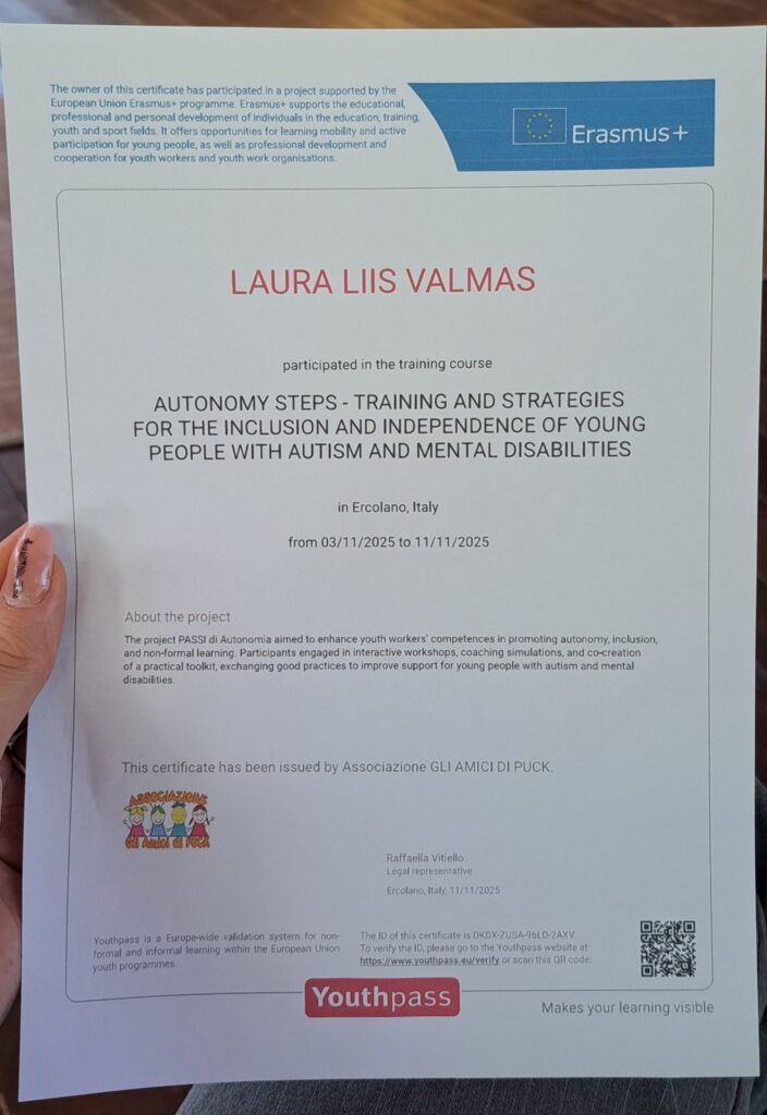 - Erasmus + (Ercolano, Itaalia), Autonomy Steps – Training and Strategies for the Inclusion and Independence of Young People with Autism and Mental Disabilities (maht 7h), tunnistus saadud 11.11.2025